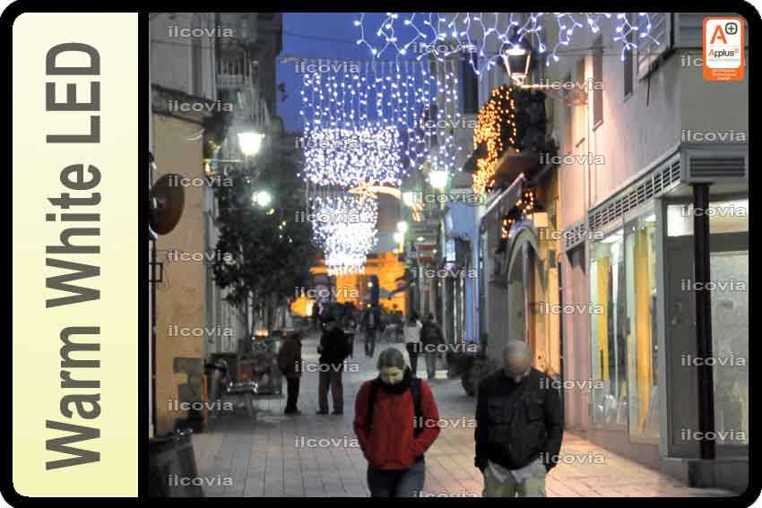 Elaboré en couleur blanc chaud qui sort des lampes type LED disposées en chaine sur toute les ramifications de plusieurs guirlandes reliées parallèlement sur un embranchement principal